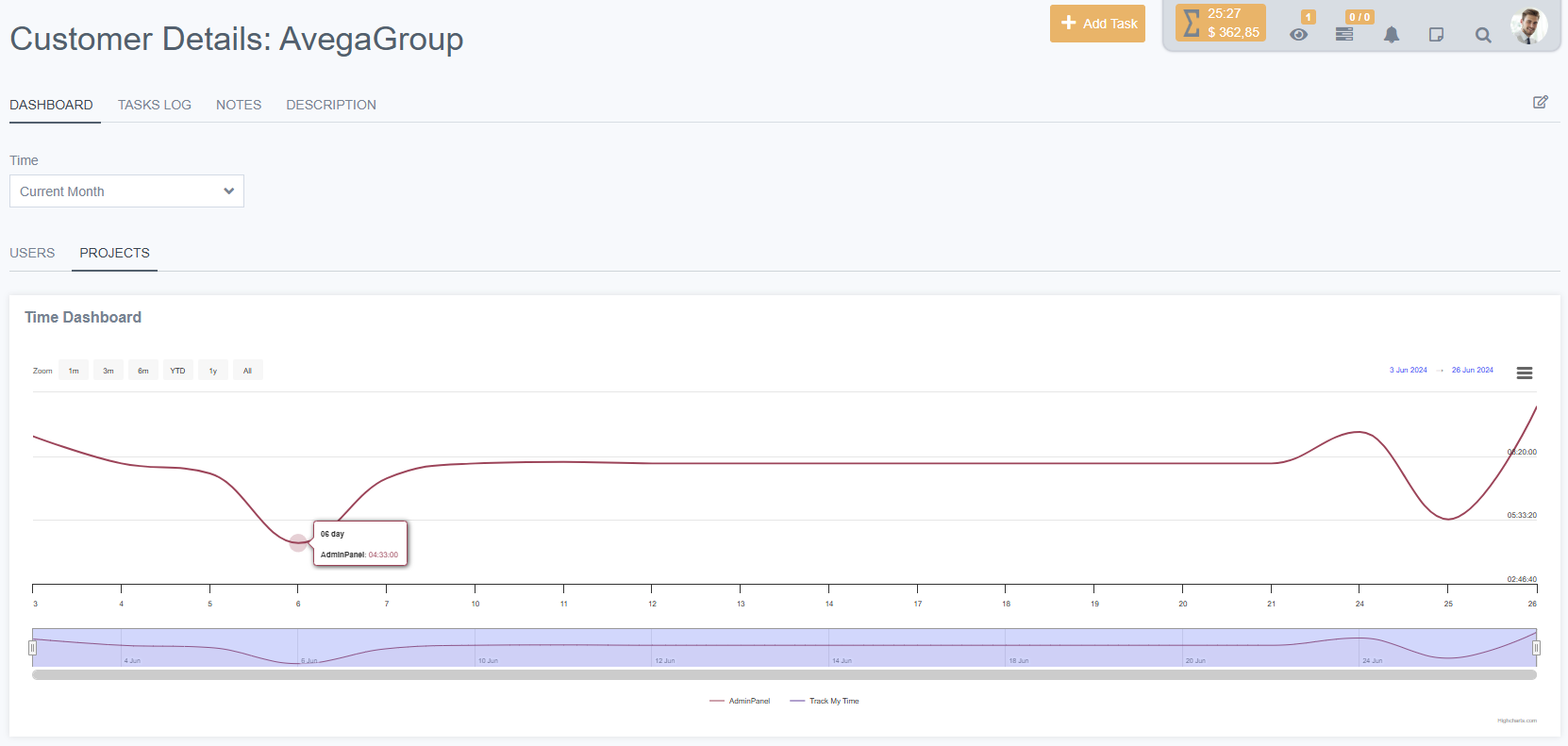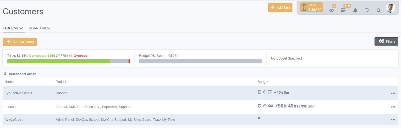 In addition to everything, there are three summary windows above the list of Customers. The first of them displays the total number of tasks for all customers, the percentage of their completion, as well as the number of those whose completion is overdue by the set completion date. The second - summary data on hourly budgets, the third - on monetary. If there are any, of course.