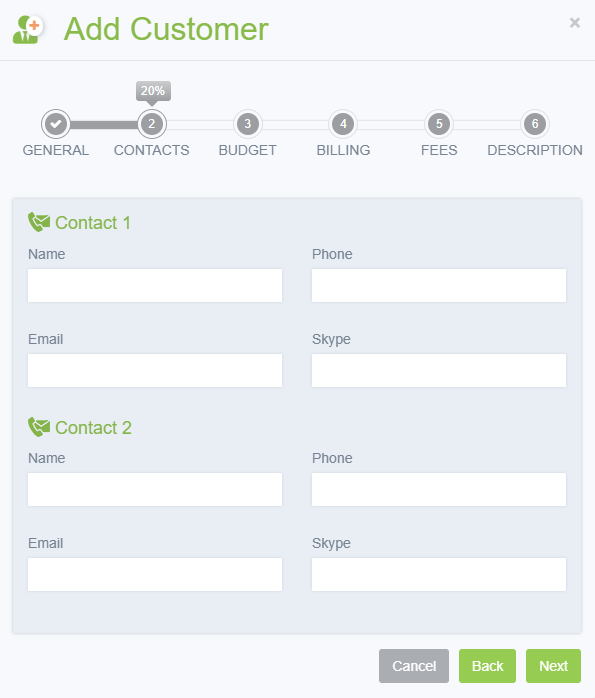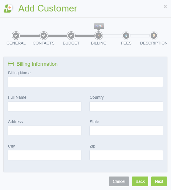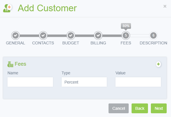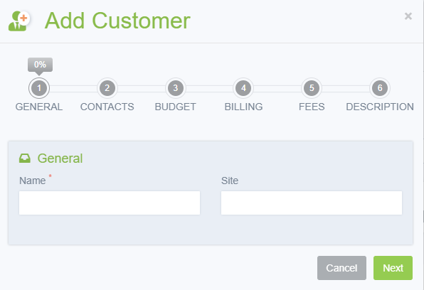 To create a Customer, you need to click the Add Customer button. A dialog box will open in which you need to go through 6 steps.