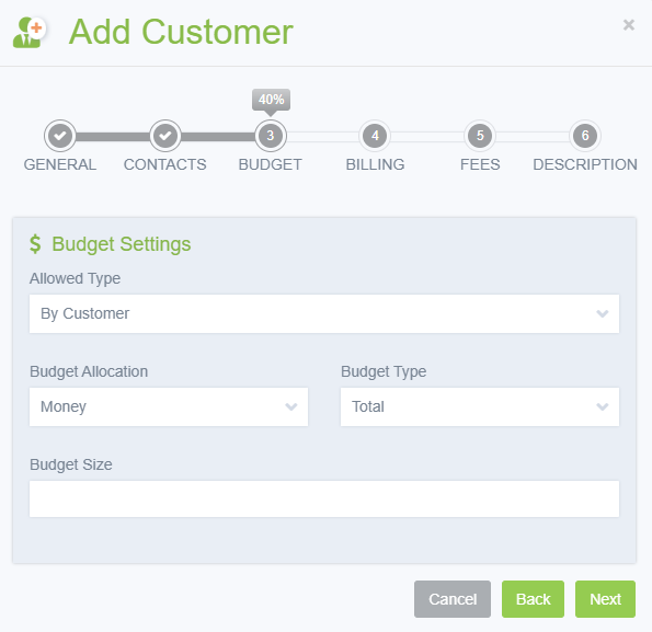 Budget settings - Acceptable type - this is the choice by which the budget will be calculated. By Project - each project will have its own budget settings. By Customer - means that all projects within will have the same time/money rate. When you select it, 2 more fields will open. Budget distribution - what exactly the budget will be calculated by, money or hours. Budget type - determines whether the budget will be unlimited or finite. If you select NOT unlimited, Allowed hours/Budget size appears, where the budget size for the specified period of time is indicated. Total is the general budget that has no time frame. That is, distribute the budget for all customer projects.