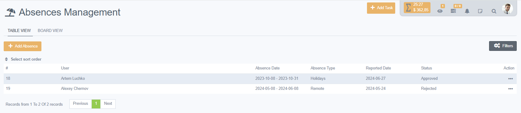 When an employee needs a vacation, they can create it in this section. Once created, this request will be displayed to admins, who can either approve or reject it.