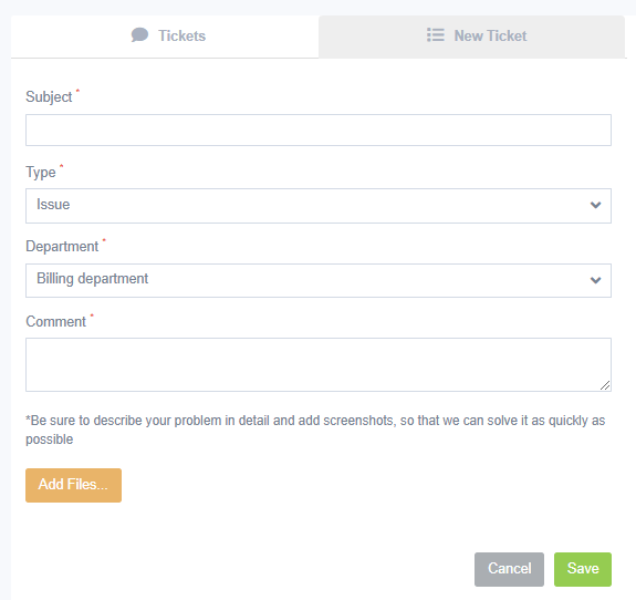 In order to report a problem or contact us, you need to create a new request. Select the type of problem, and then describe it in detail. Our support team will try to respond as quickly as possible. After the response, you will receive a notification (if you activated it in the profile settings). Also, the icon in the top menu will let you know about the response. When the problem is solved, the support team will close the request.