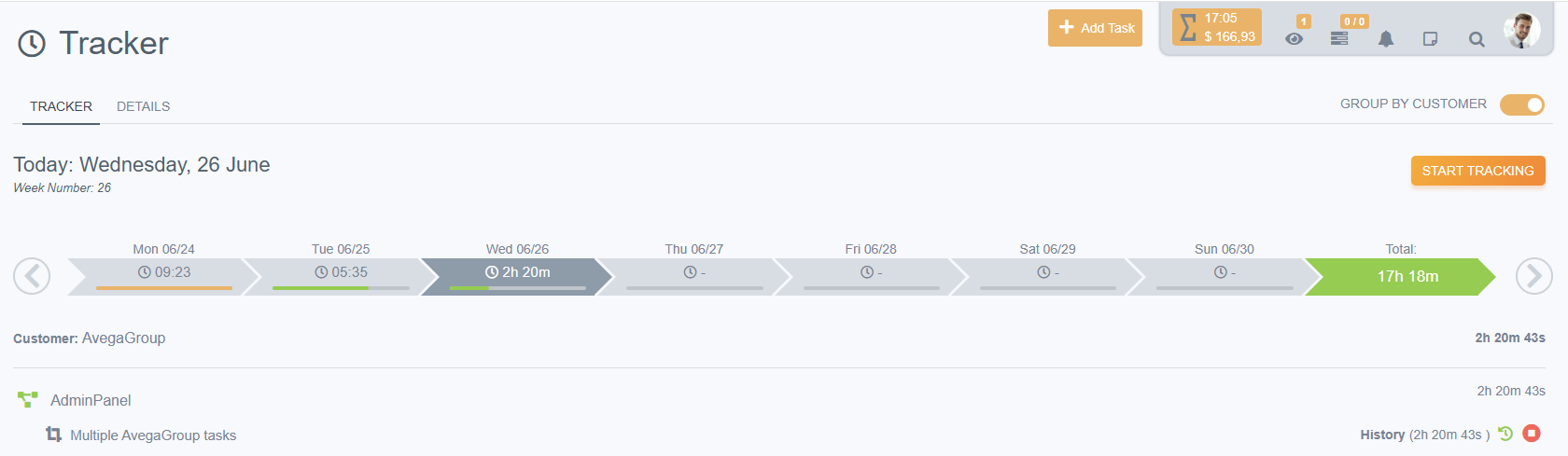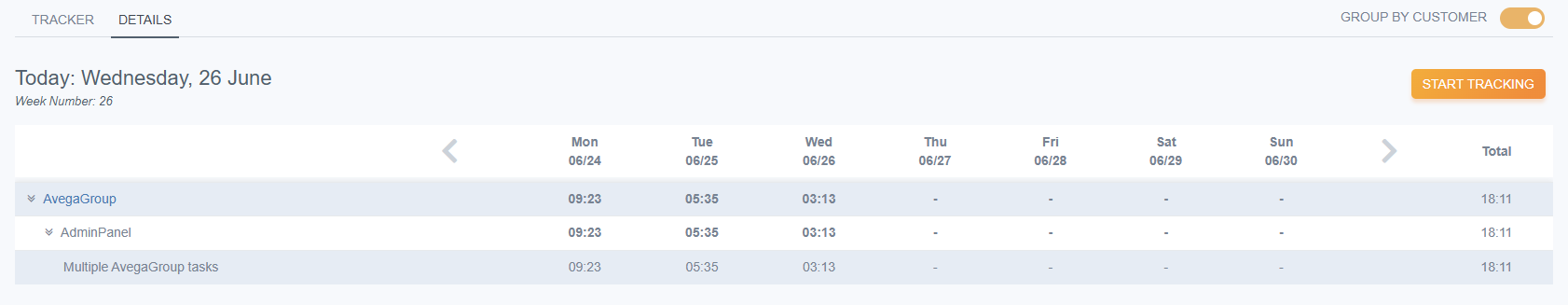 Of course, this is not the only way to launch tracking. By default, the current week opens for you, where you can view the total time worked for the week/day, as well as a more detailed list of projects and tasks for a specific day.