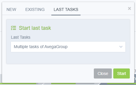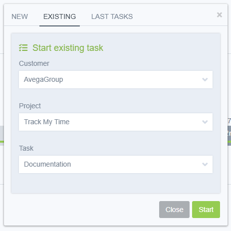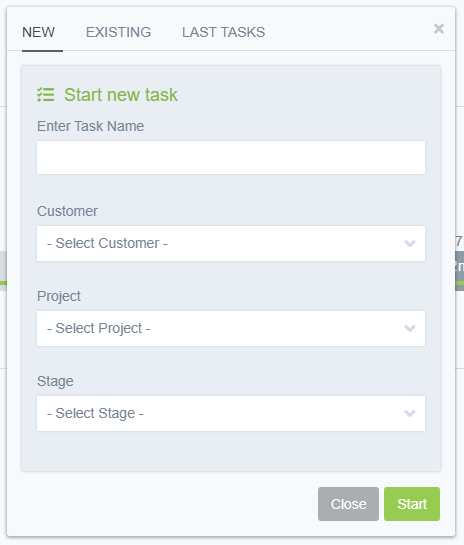 In the case when you need to start tracking the time of a new task, the easiest way is to use the "START TRACKING" button. When pressed, a dialog box will open, divided into three tabs.