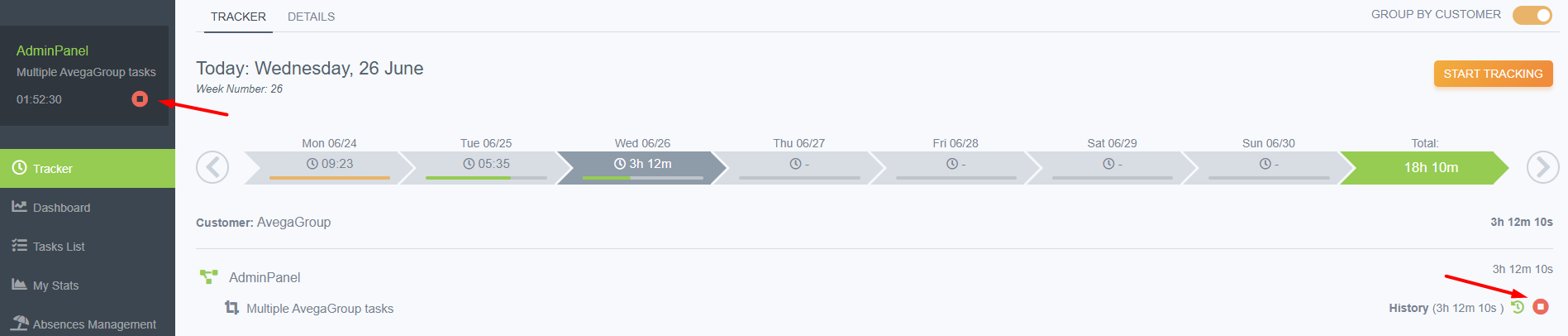 Left menu, in the tracker - If we see the necessary task in the selected day of the tracker, we can start time tracking directly from there. Also, if necessary, you can start/stop tracking of the current task directly from the left menu.