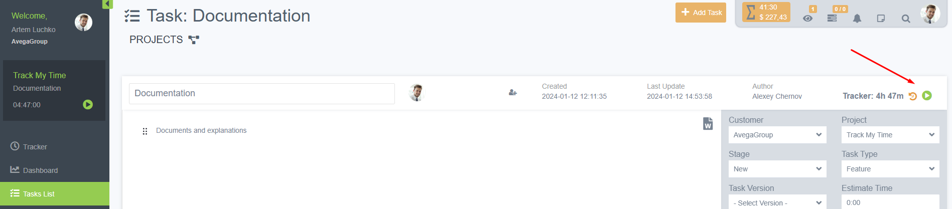 Finally, inside any task assigned to you, you can also start tracking, so to speak, without going far.